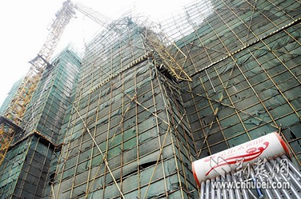 記者在黃陂區(qū)“濱水雅苑”商品房工地外看到,該樓盤主體結(jié)構(gòu)已做了10多層,其高空塔吊的起重臂已折斷,砸垮了部分腳手架。在高空塔吊旁邊的工程電梯,也被砸斷,緊挨工地的多間民房被墜落的金屬物擊穿屋頂,所幸無人受傷。